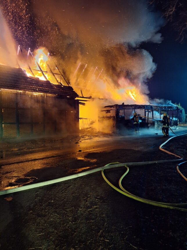Weiterhin wurde von der Leitstelle Oldenburg mitgeteilt, dass der Schulbus neben einem Gebäude steht. Bei Eintreffen der ersten Kräfte, stellten diese fest, dass sich sowohl der Bus als auch das Gebäude im Vollbrand befanden. Um einen effektiven Löschangriff durchführen zu können, wurde die Feuerwehr Werlte mit einer Drehleiter und einem Tanklöschfahrzeug nachalamiert. Durch den eingerichteten Pendelverkehr und die Wasserentnahme aus einem nahgelegenen Hydranten konnte das Feuer schnell eingedämmt werden. Gegen 6 Uhr waren alle Flammen gelöscht und die Einsatzkräfte konnten die Einsatzstelle verlassen.
