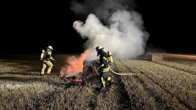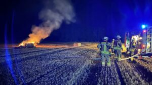 Um 22:42 Uhr wurde die Feuerwehr Harpstedt in den Wunderburger Weg alarmiert. Das Einsatzstichwort lautete „Brennender Strohballen“. 22 Einsatzkräfte rückten mit fünf Fahrzeugen zur Einsatzstelle aus. Während der Anfahrt informierte die Leitstelle die Einsatzkräfte, dass sich das Feuer möglicherweise weiter ausbreite. Vor Ort konnte der Einsatzleiter jedoch schnell Entwarnung geben. Es brannte lediglich ein einzelner Quaderballen auf einem Stoppelfeld. Ein Trupp unter Atemschutz ging im Erstangriff mit einem C-Rohr vor und löschte die Flammen.