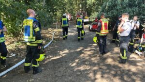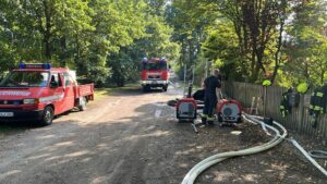 Die Züge richteten daraufhin mehrere Wasserentnahmestellen ein – unter anderem mit Faltbehältern – und organisierten einen Pendelverkehr mit mehreren Tanklöschfahrzeugen in die jeweiligen Einsatzabschnitte. Zahlreiche Strahlrohre sowie Beregner hielten das Feuer in Schach. Parallel dazu klingelten Einsatzkräfte bei angrenzenden Anwohnern, um eine mögliche Evakuierung vorzubereiten: Es wurde geklärt, ob Pflegebedürftigkeit vorliegt, wie viele Personen im Haushalt leben, ob besondere Wertgegenstände gesichert werden müssen, ob eine Unterkunft benötigt wird und ob Haustiere zu versorgen sind.