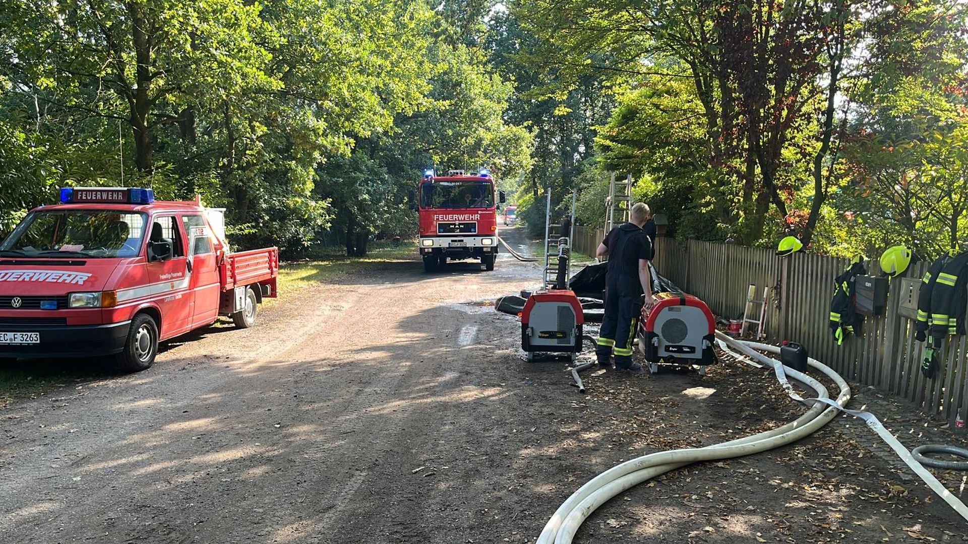 Die Züge richteten daraufhin mehrere Wasserentnahmestellen ein – unter anderem mit Faltbehältern – und organisierten einen Pendelverkehr mit mehreren Tanklöschfahrzeugen in die jeweiligen Einsatzabschnitte. Zahlreiche Strahlrohre sowie Beregner hielten das Feuer in Schach. Parallel dazu klingelten Einsatzkräfte bei angrenzenden Anwohnern, um eine mögliche Evakuierung vorzubereiten: Es wurde geklärt, ob Pflegebedürftigkeit vorliegt, wie viele Personen im Haushalt leben, ob besondere Wertgegenstände gesichert werden müssen, ob eine Unterkunft benötigt wird und ob Haustiere zu versorgen sind.