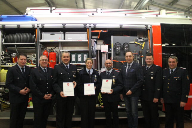 Ortsbrandmeister Björn Rastedt ließ die beeindruckenden Werdegänge der Jubilare Revue passieren. Besonders hob er hervor, dass Achim Bruns als Enkel von Heinz Bruns – der 1960 die erste Jugendfeuerwehr ins Leben rief – und als Sohn von Hans-Heinrich Bruns, der lange Jahre unter anderem Ortsbrandmeister war, die Freiwillige Feuerwehr praktisch mit in die Wiege gelegt wurde. Für ihn sei ein Leben ohne die Feuerwehr schlichtweg undenkbar gewesen. Bürgermeister Matthias Huber überbrachte die Grüße von Rat und Verwaltung. Er betonte, dass man sich stets auf die vier gut ausgebildeten und ausgestatteten Feuerwehren der Gemeinde verlassen könne und dies mit Stolz erfülle. Er dankte den drei Jubilaren für ihren langjährigen ehrenamtlichen Einsatz zum Wohle der Bevölkerung. Jennifer Rastedt erhielt die Urkunde und Ehrennadel in Silber für 25 Jahre Mitgliedschaft, Achim Bruns und Hans-Dieter Lüers wurden jeweils mit Urkunde und Ehrennadel für 40 Jahre ausgezeichnet. Auch Gemeindebrandmeister Dennis Otte und der stellvertretende Kreisbrandmeister Thorsten Prüsener gehörten zu den Gratulanten und überreichten im Namen der Gemeinde- und Kreisfeuerwehren Präsente an die Geehrten.
